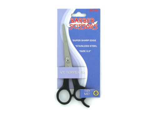 Barber scissors are super sharp and ice tempered making them ideal for personal or professional use. Scissors have plastic handles and a steel blade. Scissors are packaged on a tie card with hanging hole. Scissors measure 5 1/2".