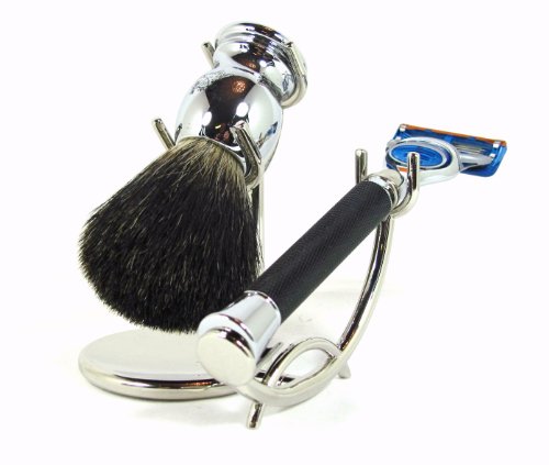 The iGRIP Black Razor set is our #1 seller and continues to impress the celebrity in all of us. It's a hand-made black handle razor with a laser engraved grip. This razor ensures the most smooth & comfortable shave experience using the latest advances in technology. Comes with a matching chrome badger-hair shave brush and a very modern looking shav